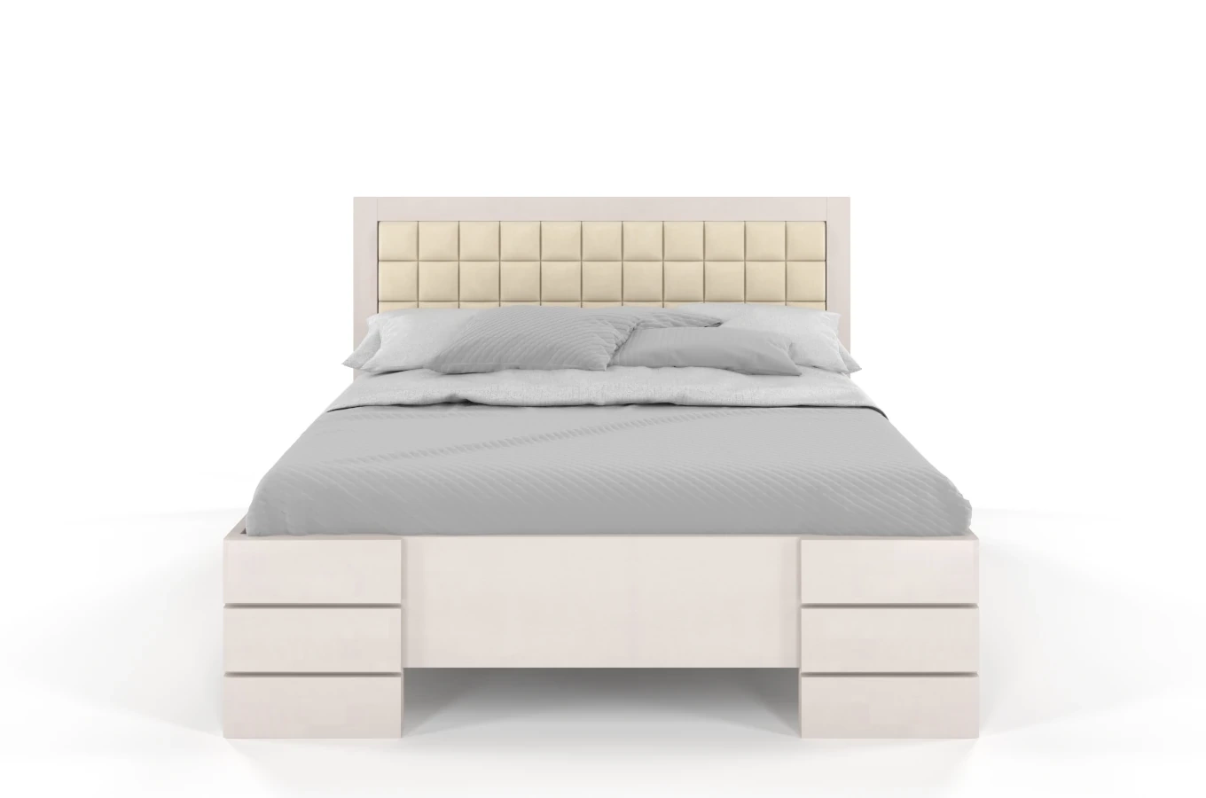 Elementem wyróżniającym łóżko Visby GOTLAND High jest wyższe niż standardowe ułożenie materaca oraz wysoki, tapicerowany w kwadraty zagłówek zamknięty w drewnianej ramie, który wypełniony został pianką tapicerską i wykończony przyjemną w dotyku tkaniną (kolor do wyboru ze wzornika). Na takim zagłówku można swobodnie oprzeć poduszkę i z przyjemnością czytać książkę nawet przez długi czas. Zagłówek nie jest wysoki – całkowita wysokość łóżka to 96 cm – nie ma więc obaw, że łóżko to zdominuje sypialnię. Wręcz przeciwnie, będzie jej gustownym wyposażeniem.