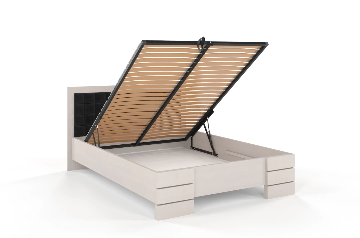 Elementem wyróżniającym łóżko Visby GOTLAND High&BC jest praktyczna skrzynia na pościel, którą otwiera się lekko dzięki zastosowanym siłownikom gazowym oraz specjalnej taśmie zamocowanej wokół ramy skrzyni.