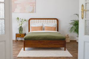 Drewniane łóżko z tapicerowanym zagłówkiem i zaokrąglonych brzegach
