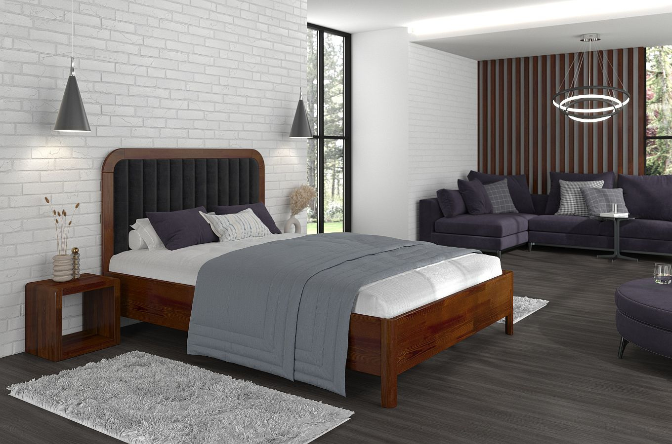 Drewniane łóżko do sypialni z tapicerowanym zagłówkiem
