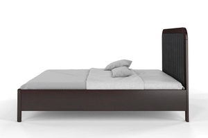 Drewniane łóżko z zagłówkiem tapicerowanym w pionowe pasy