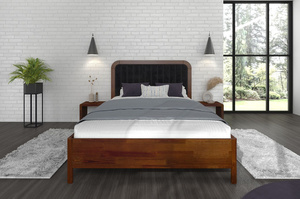 Drewniane łóżko do sypialni z tapicerowanym zagłówkiem