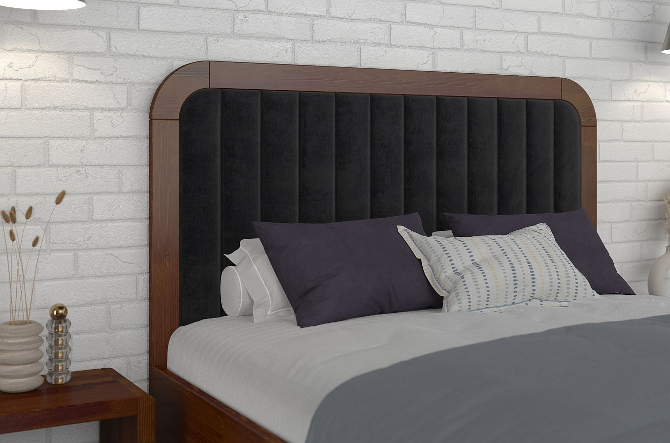 Drewniane łóżko z tapicerowanym zagłówkiem i zaokrąglonych brzegach