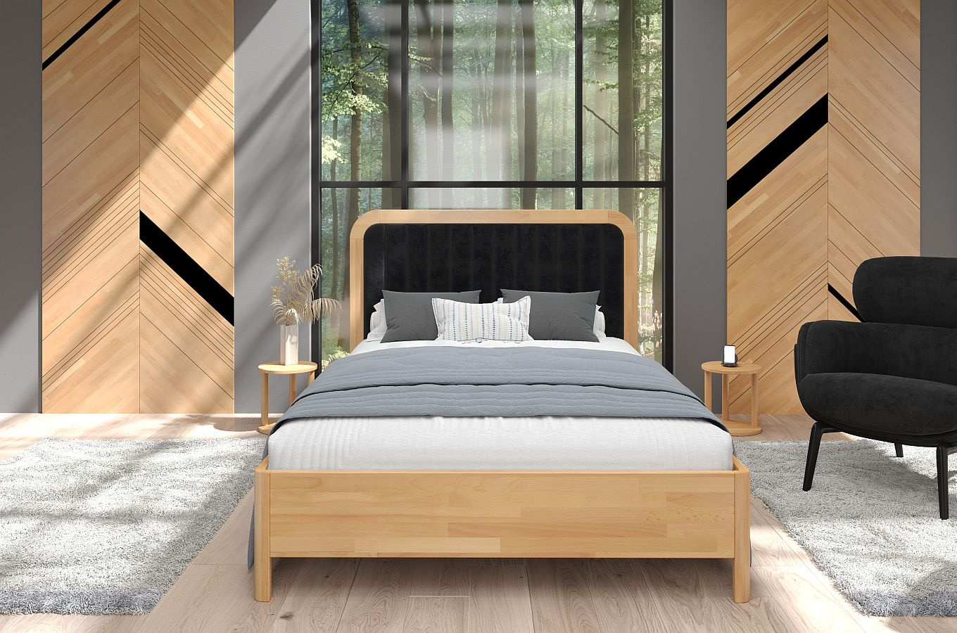 Drewniane łóżko z tapicerowanym zagłówkiem i zaokrąglonych brzegach