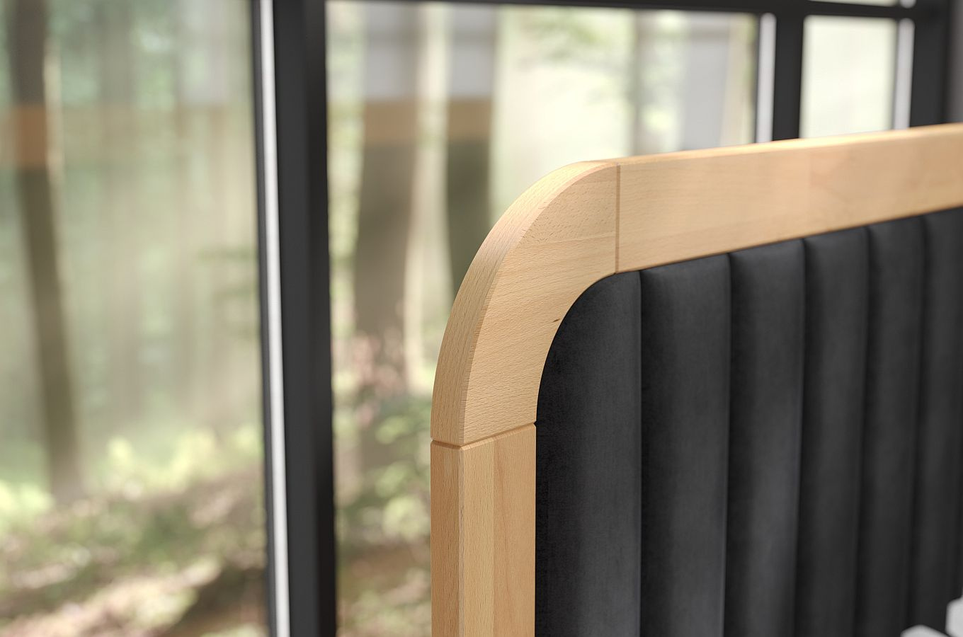 Elementem wyróżniającym się jest wysoki, tapicerowany zagłówek z pionowymi przeszyciami, otoczony drewnianą ramą o zaokrąglonych krawędziach. Zaokrąglone są również wysokie nogi łóżka. Brak ostrych krawędzi powoduje, że łóżko jest bezpieczne w użytkowaniu i wyróżnia się na tle innych modeli. Odpowiednia wysokość nóg ułatwi sprzątanie - pod łóżkiem zmieści się robot sprzątający !