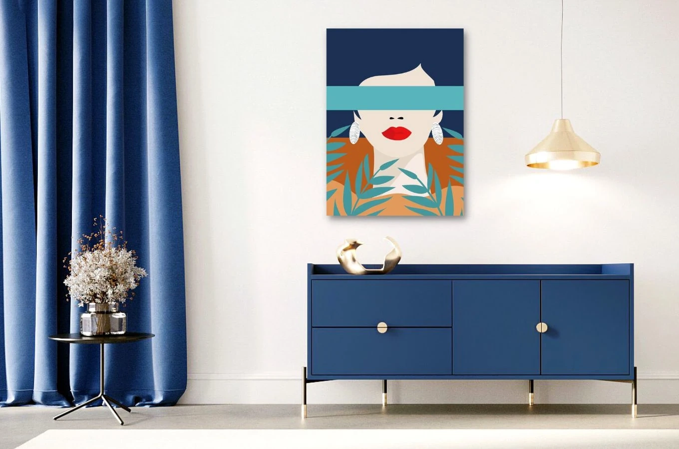 COLETTE to autorski obraz stworzony na wyłączność marki ArtPunk, który już wkrótce podkreśli wyjątkowy charakter Twojego wnętrza. Grafika przedstawia tajemniczą dziewczynę, której oczy zasłania lazurowy pasek. Ten sam kolor mają gałązki palmowe, przysłaniające szyję dziewczyny. COLETTE to wierne odwzorowanie kobiety sukcesu - kobiety, która nie boi się nowych wyzwań oraz dumnie idzie przez życie z uniesioną głową. Poczucie własnej wartości podkreśla czerwień szminki, duże kolczyki w marmurowy deseń oraz elegancka fryzura z zachodzącymi na twarz kosmykami włosów. Bądź jak COLETTE - uwierz w siebie!