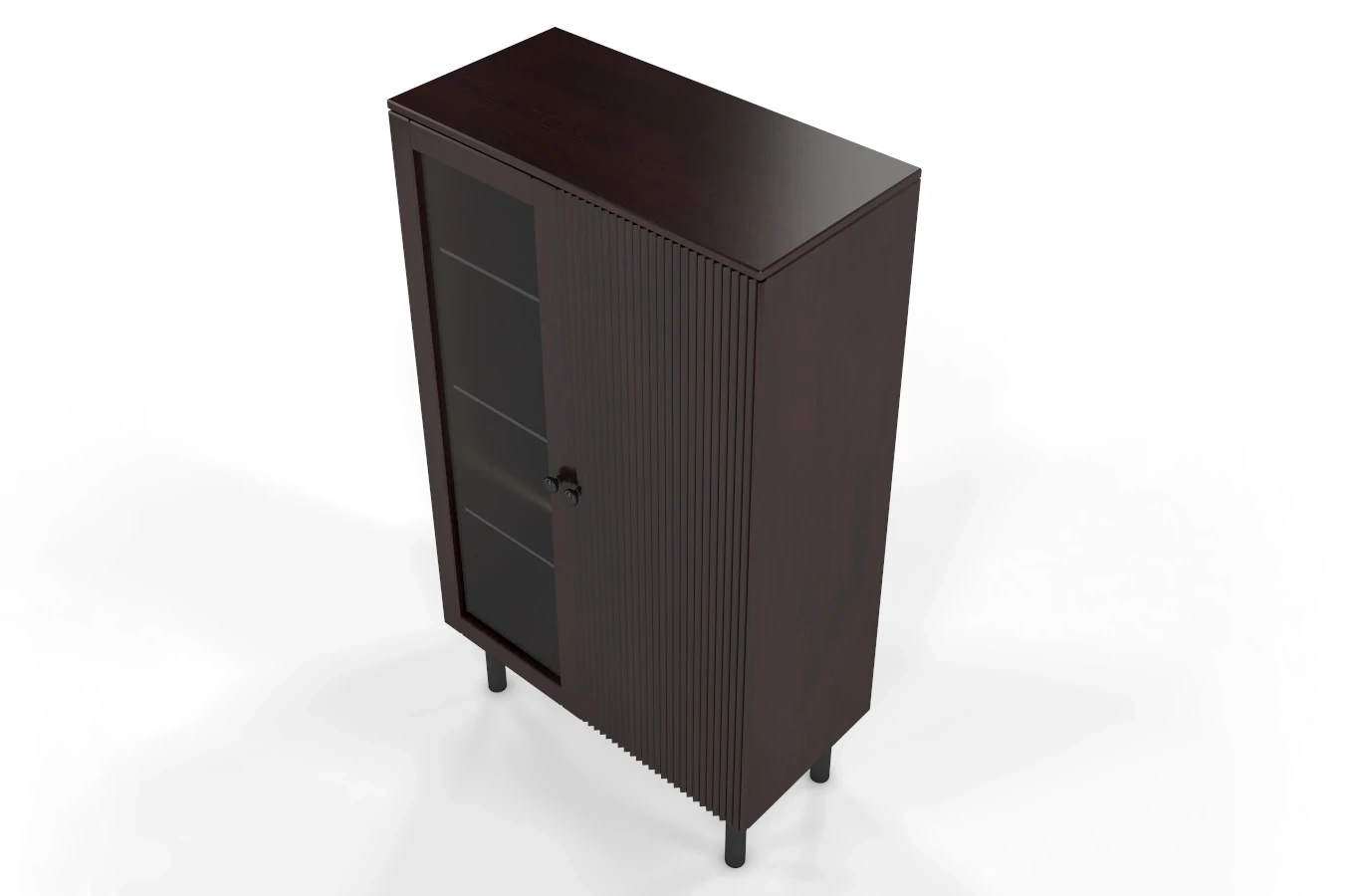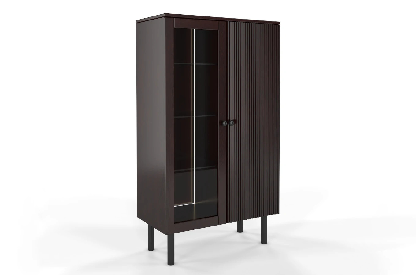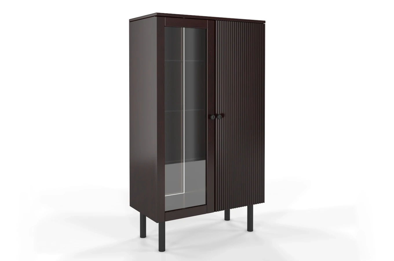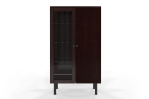 Elegancki, a zarazem funkcjonalny mebel, który sprawdzi się zarówno w salonie, gabinecie, jak i jadalni. Lewe, przeszklone skrzydło drzwi - doskonale eksponuje przedmioty ustawione wewnątrz oraz chroni je przed zakurzeniem. Prawe skrzydło drzwi, które zdobi efektowne pionowe frezowanie - ukrywa rzeczy osobiste, a także nadaje całości nowoczesny wymiar.