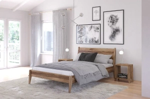 To nowoczesne i oszczędne w formie drewniane łóżko do sypialni, które zdecydowanie wyróżnia się na tle innych, drewnianych łóżek. Posiada ono drewniany zagłówek, który w zestawieniu z podpierającymi go wspornikami, które są jednocześnie jego krawędziami, tworzy bardzo ciekawą formę. Te właściwości w zestawieniu ukośnie uciętymi nogami sprawiają, że mebel wygląda bardzo lekko i dynamicznie. Łóżko to na pewno spodoba się osobom lubiącym nowoczesny styl.