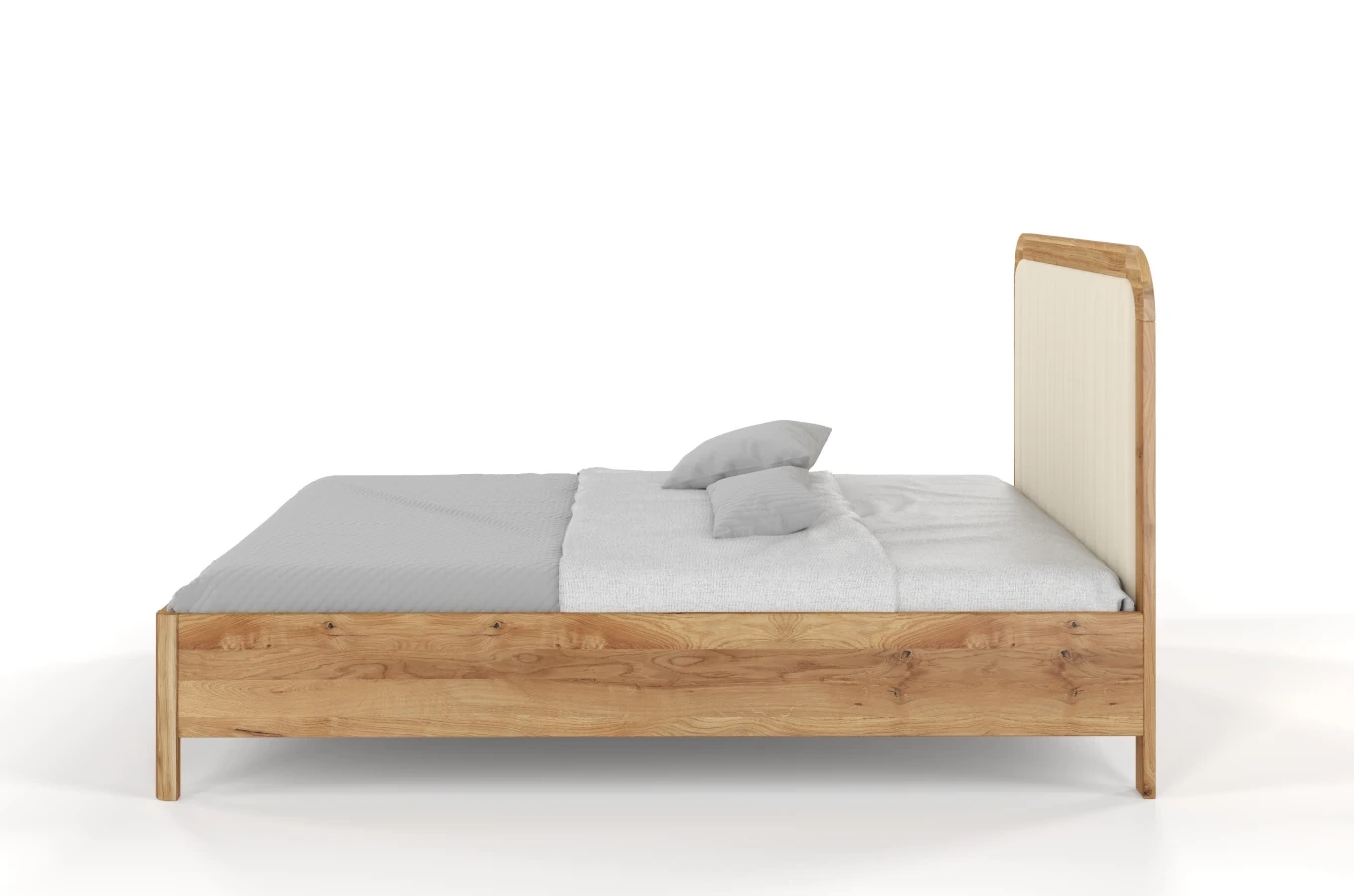 Drewniane łóżko z tapicerowanym zagłówkiem i zaokrąglonych brzegach