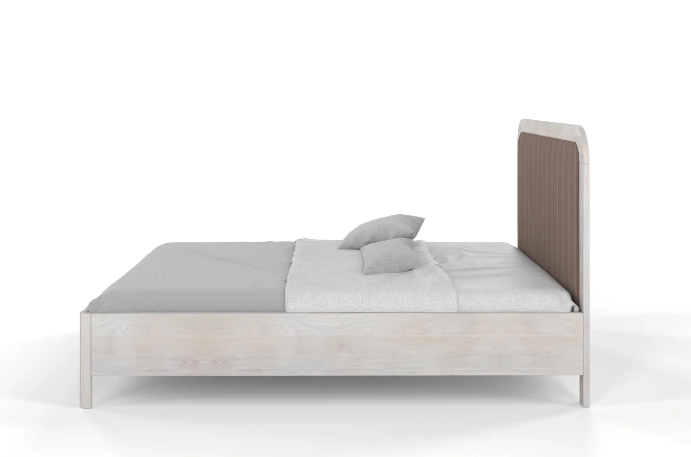 Drewniane łóżko z tapicerowanym zagłówkiem i zaokrąglonych brzegach