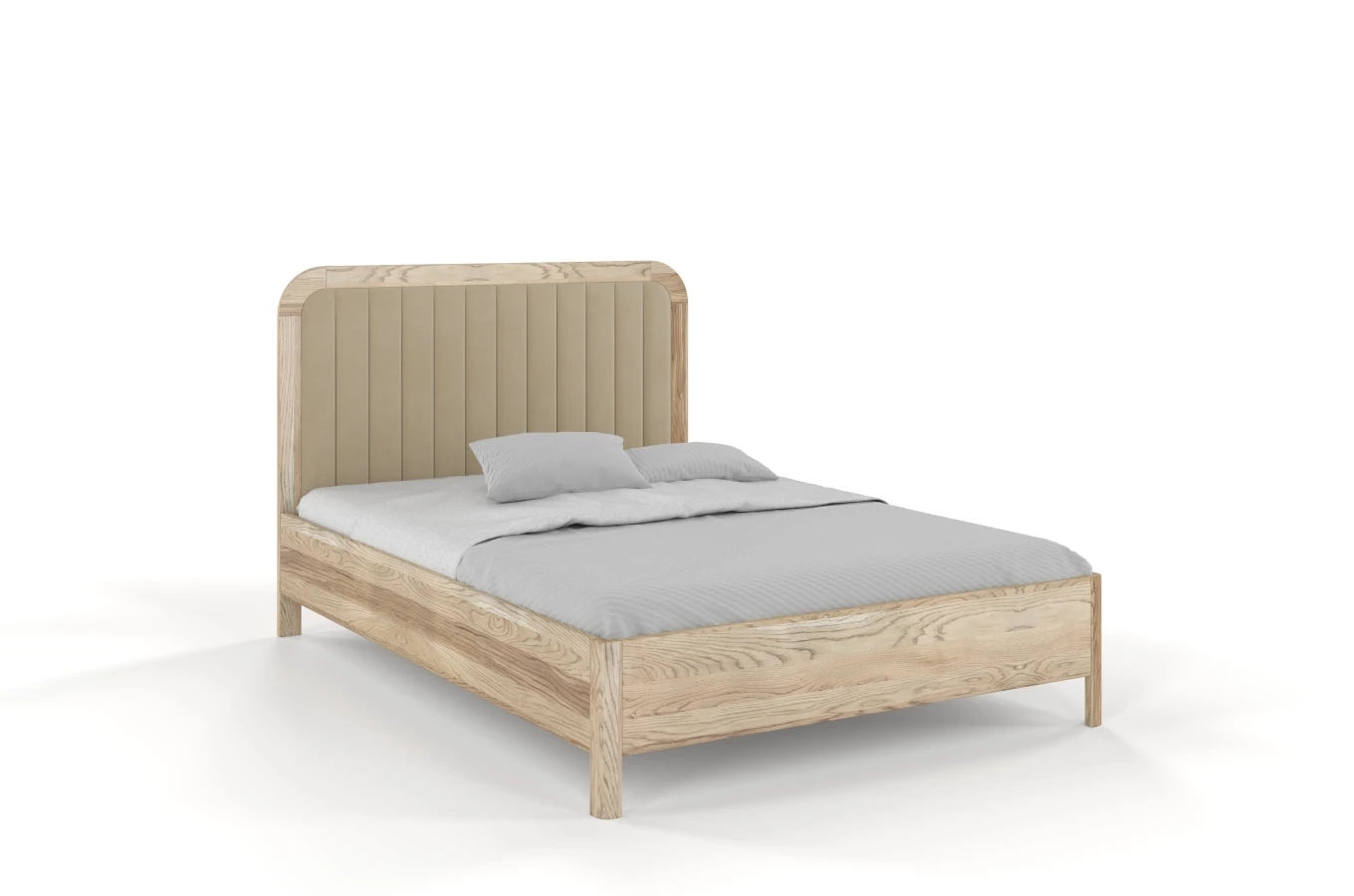 Drewniane łóżko z tapicerowanym zagłówkiem i zaokrąglonych brzegach