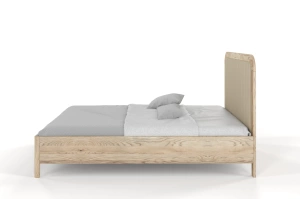 Drewniane łóżko do sypialni z tapicerowanym zagłówkiem
