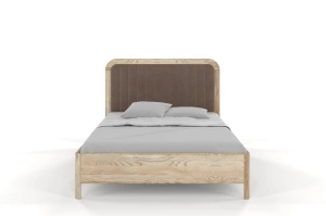 Drewniane łóżko z tapicerowanym zagłówkiem i zaokrąglonych brzegach