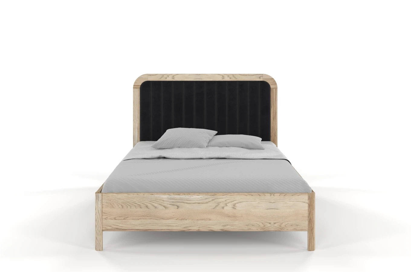Drewniane łóżko z tapicerowanym zagłówkiem i zaokrąglonych brzegach