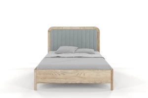 Drewniane łóżko z zagłówkiem tapicerowanym w pionowe pasy