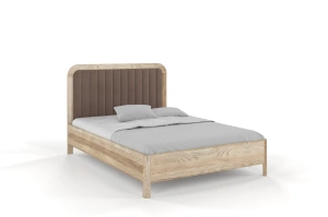 Drewniane łóżko z tapicerowanym zagłówkiem i zaokrąglonych brzegach