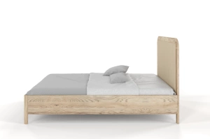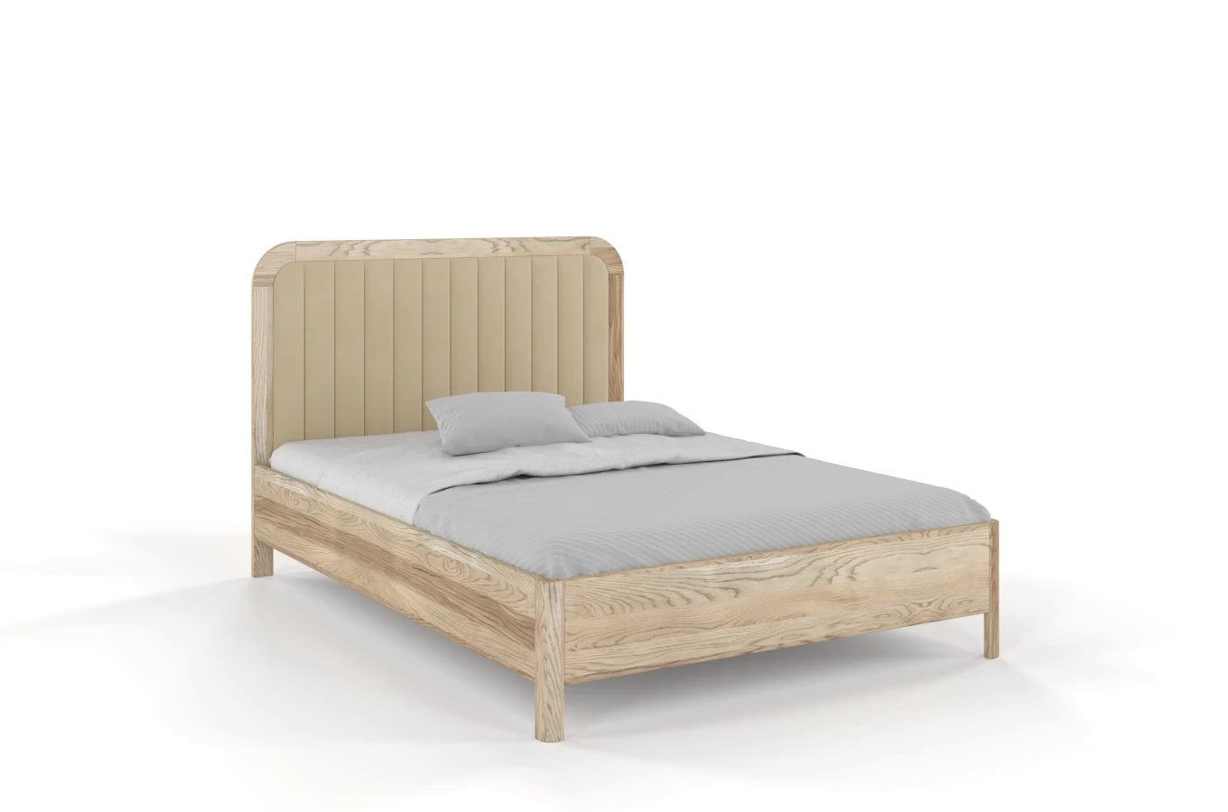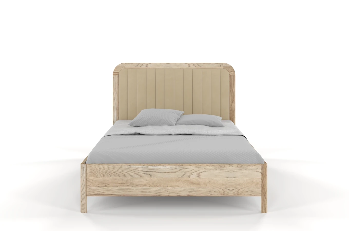 Drewniane łóżko z tapicerowanym zagłówkiem i zaokrąglonych brzegach