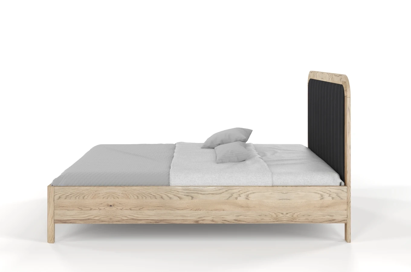 Drewniane łóżko z tapicerowanym zagłówkiem i zaokrąglonych brzegach