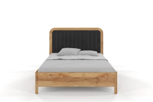Drewniane łóżko z tapicerowanym zagłówkiem i zaokrąglonych brzegach