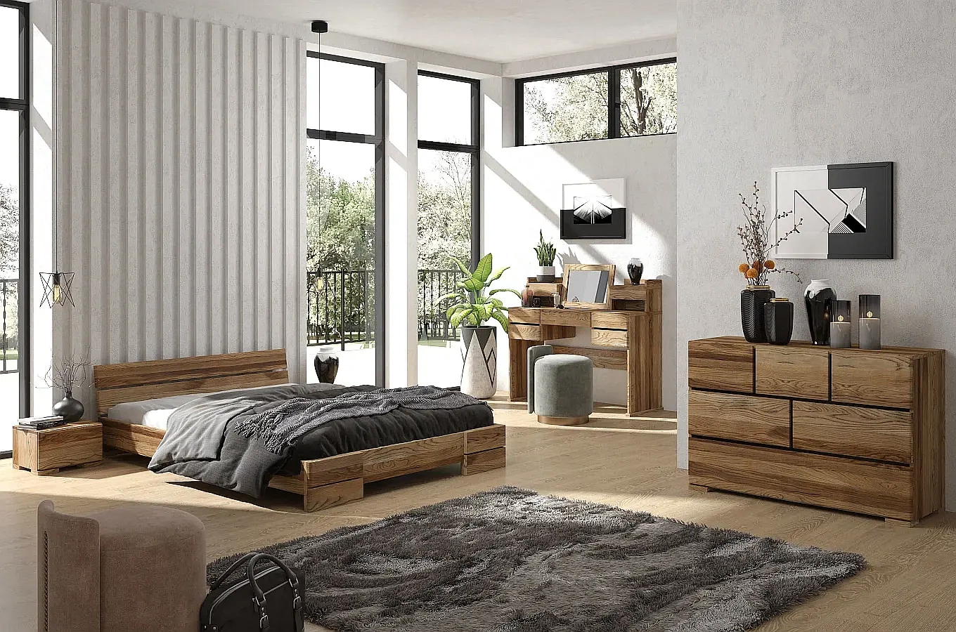 Dzięki niskiemu ułożeniu materaca, łóżko SANDEMO nie dominuje w sypialni, ale doskonale wpisuje się w jej wnętrze i stylistykę. Taka wysokość spełnia wszelkie potrzeby wygody przy jednoczesnym zachowaniu zgrabnych gabarytów. Dopełnieniem tego nienachalnego minimalizmu jest zagłówek wykonany z dwóch poziomo ułożonych desek. Zaoblenie na górnej krawędzi szczytowej deski zagłówka nawiązuje do podobnego rozwiązania zastosowanego w nogach.