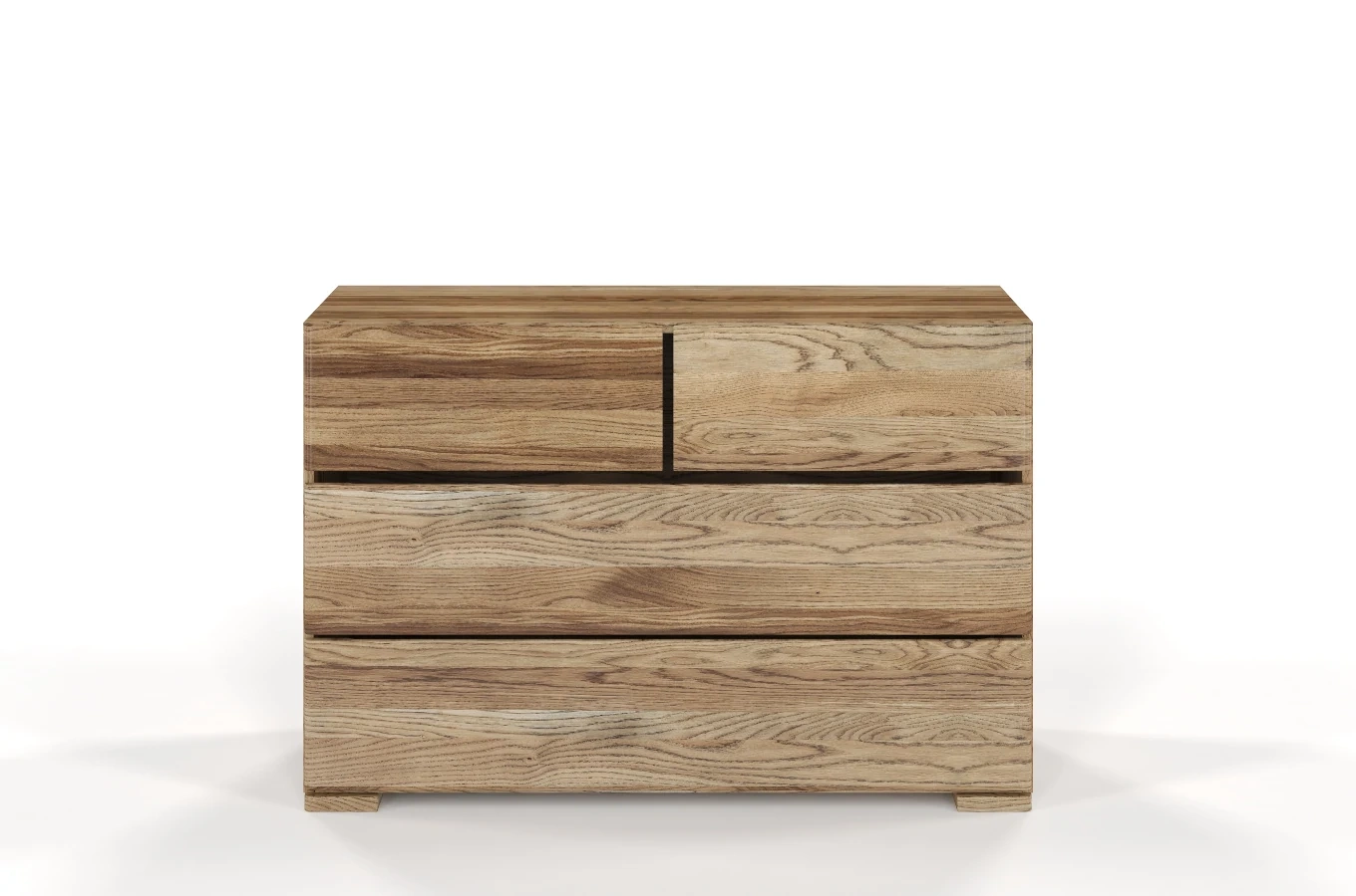 • Drewniana, dębowa komoda z czterema szufladami różnej wielkości. Jej nowoczesny i uniwersalny charakter podkreśla gładki front, prosta forma i brak uchwytów. Dzięki temu będzie doskonałym uzupełnieniem każdej sypialni.