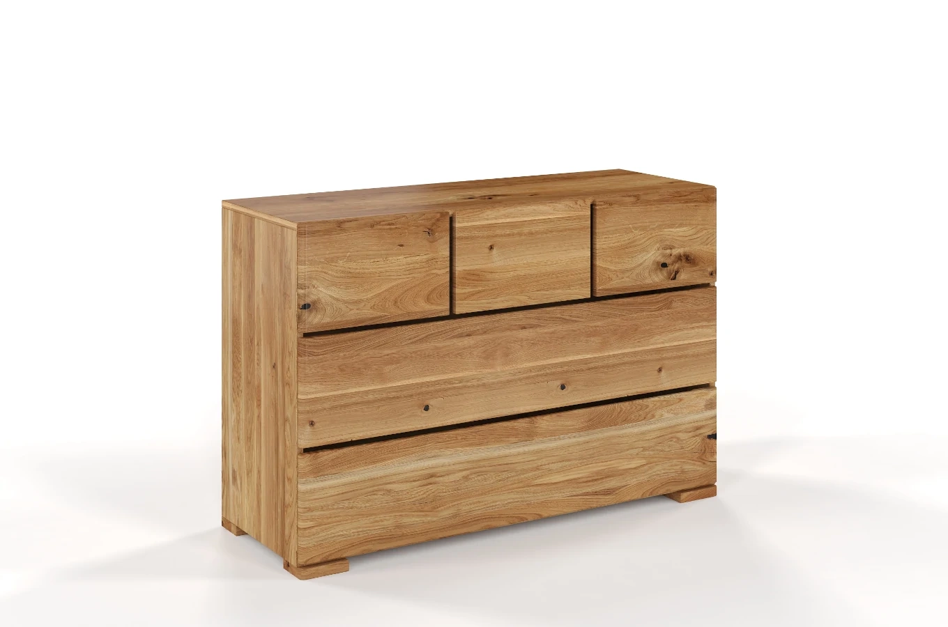 - Na "plecach" komody oraz na dnach szuflad znajduje się sklejka brzozowa; dla koloru olej naturalny, bielony, retro - malowana tym samym lakierem co korpus / dla koloru lakier naturalny - kombinacja podobna do dębu