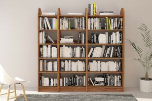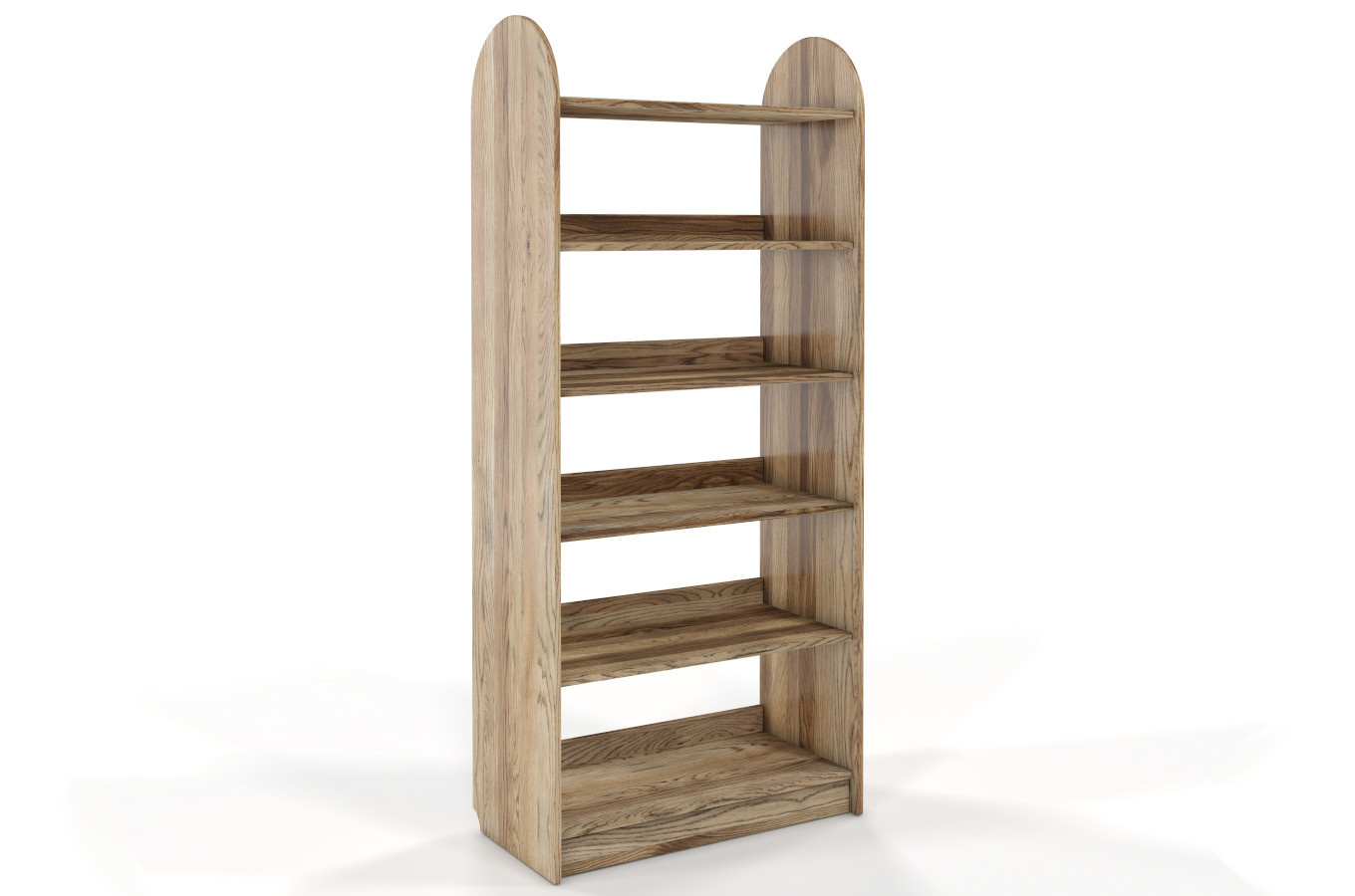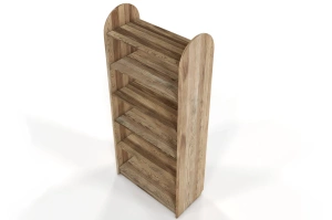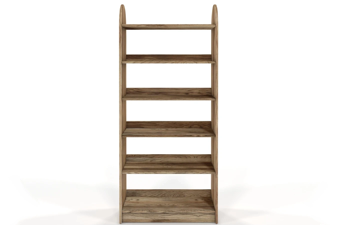Minimalistyczny, a zarazem funkcjonalny mebel w skandynawskim stylu, służący do przechowywania książek i bibelotów. Na jego praktyczny wymiar wpływa nowoczesny kształt - z zaokrąglonymi na górze ściankami bocznymi oraz przemyślana konstrukcja. Regał wyposażony jest w 6 półek; 3 z nich zamontowane są na stałe - co zwiększa stabilność mebla, natomiast pozostałe 3 można regulować - co pozwala dostosować wysokość półek do stojących na nich przedmiotów. Dodatkowo, półki zakończone są listwami zapobiegającymi przypadkowemu spadaniu przedmiotów. Kolejnym atutem mebla jest możliwość przymocowania go do ściany, co bezpośrednio przekłada się na bezpieczeństwo użytkowania. Wycięcie w dolnej części pleców pozwala dosunąć regał do ściany.