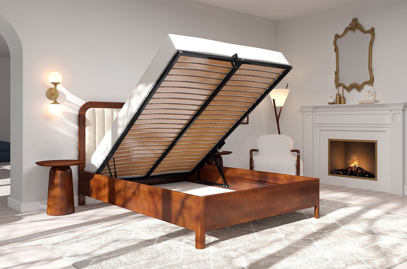 Bukowe łóżko z tapicerowanym zagłówkiem i pojemną skrzynią