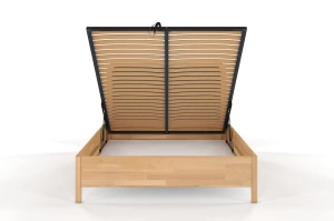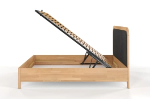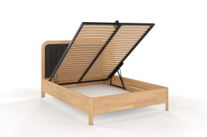 Bukowe łóżko z tapicerowanym zagłówkiem i pojemną skrzynią