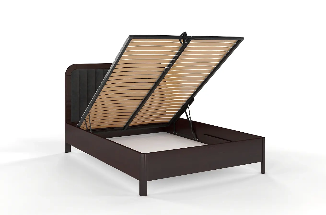 Drewniane łóżko do sypialni z tapicerowanym zagłówkiem