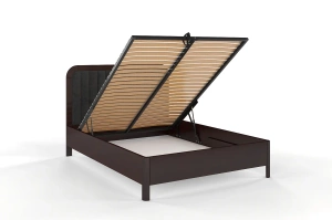 Drewniane łóżko z zagłówkiem tapicerowanym w pionowe pasy