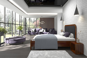 Drewniane łóżko do sypialni z tapicerowanym zagłówkiem