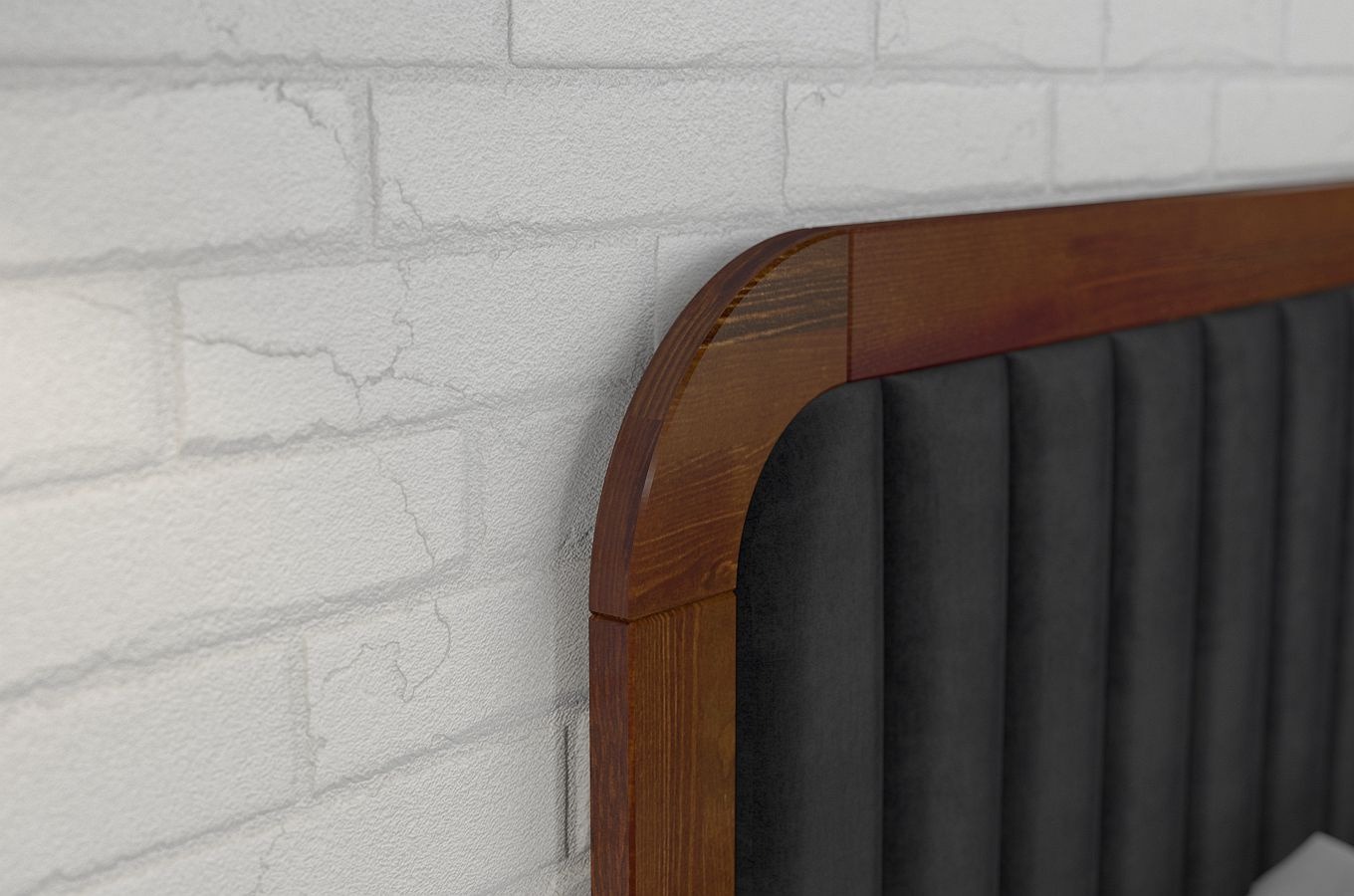 Drewniane łóżko z tapicerowanym zagłówkiem i zaokrąglonych brzegach