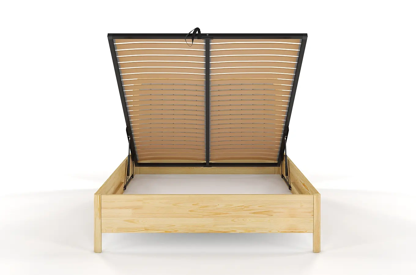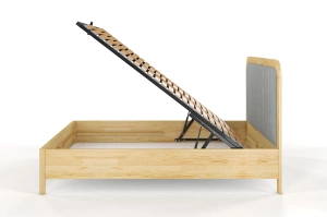 Sosnowe łóżko z tapicerowanym zagłówkiem i pojemną skrzynią