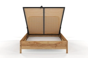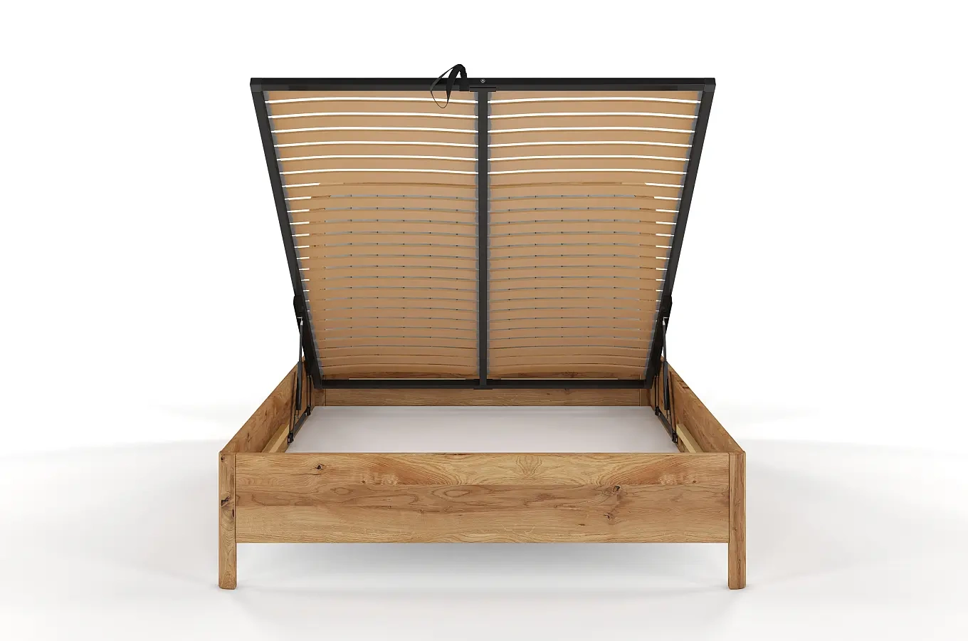 Dębowe łóżko z tapicerowanym zagłówkiem i pojemną skrzynią