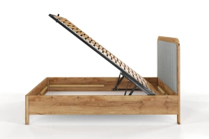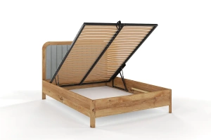 • Tapicerowane łóżko drewniane dębowe Visby MODENA BC z wysokim zagłówkiem / 140x200 cm, lakier naturalny, zagłówek Casablanca 2314 (skrzynia na pościel)