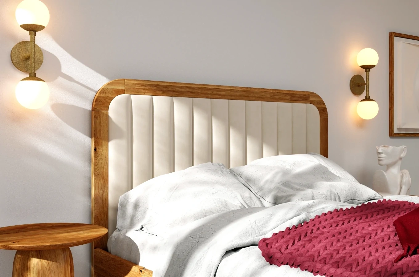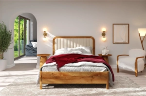 Drewniane łóżko z tapicerowanym zagłówkiem i zaokrąglonych brzegach