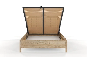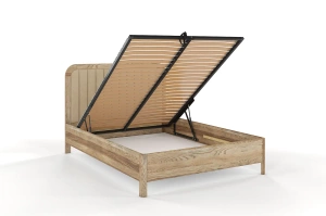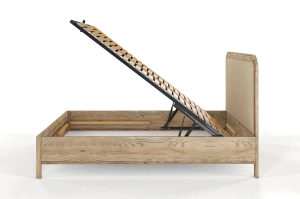 Dębowe łóżko z tapicerowanym zagłówkiem i pojemną skrzynią