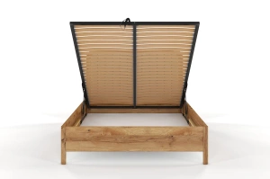 Dębowe łóżko z tapicerowanym zagłówkiem i pojemną skrzynią