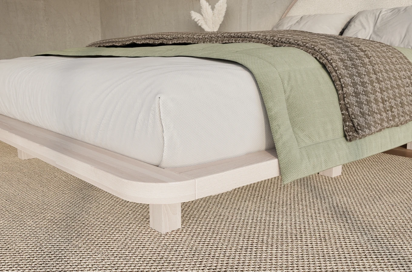 Tapicerowane łóżko drewniane w stylu japandi