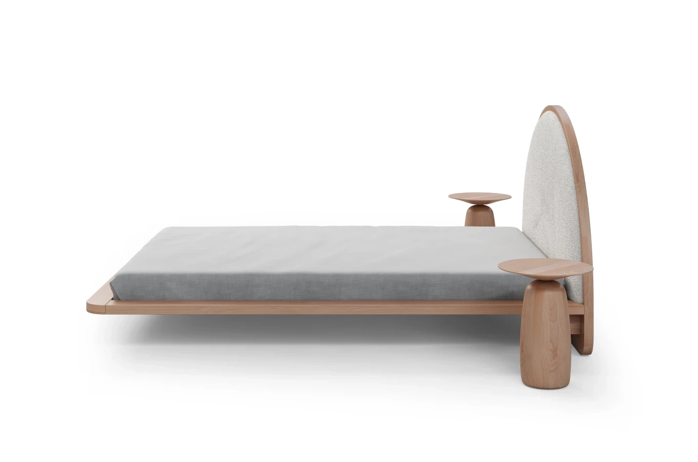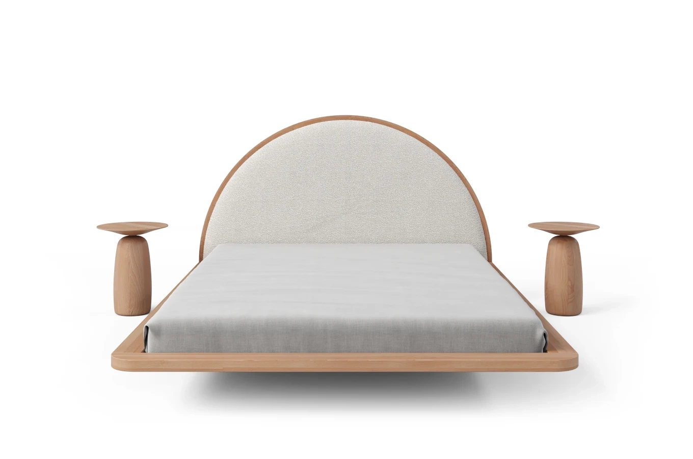 Centralny punkt łóżka stanowi tapicerowany zagłówek o owalnym kształcie, wykończony tkaniną typu boucle (Catch Me 01), która wyróżnia się przyjemną w dotyku fakturą i eleganckim wyglądem. Gruba, 4-centymetrowa rama nie tylko podnosi walory estetyczne mebla, ale również pełni funkcję praktyczną – to idealne miejsce na odłożenie książki, telefonu czy delikatnej dekoracji.