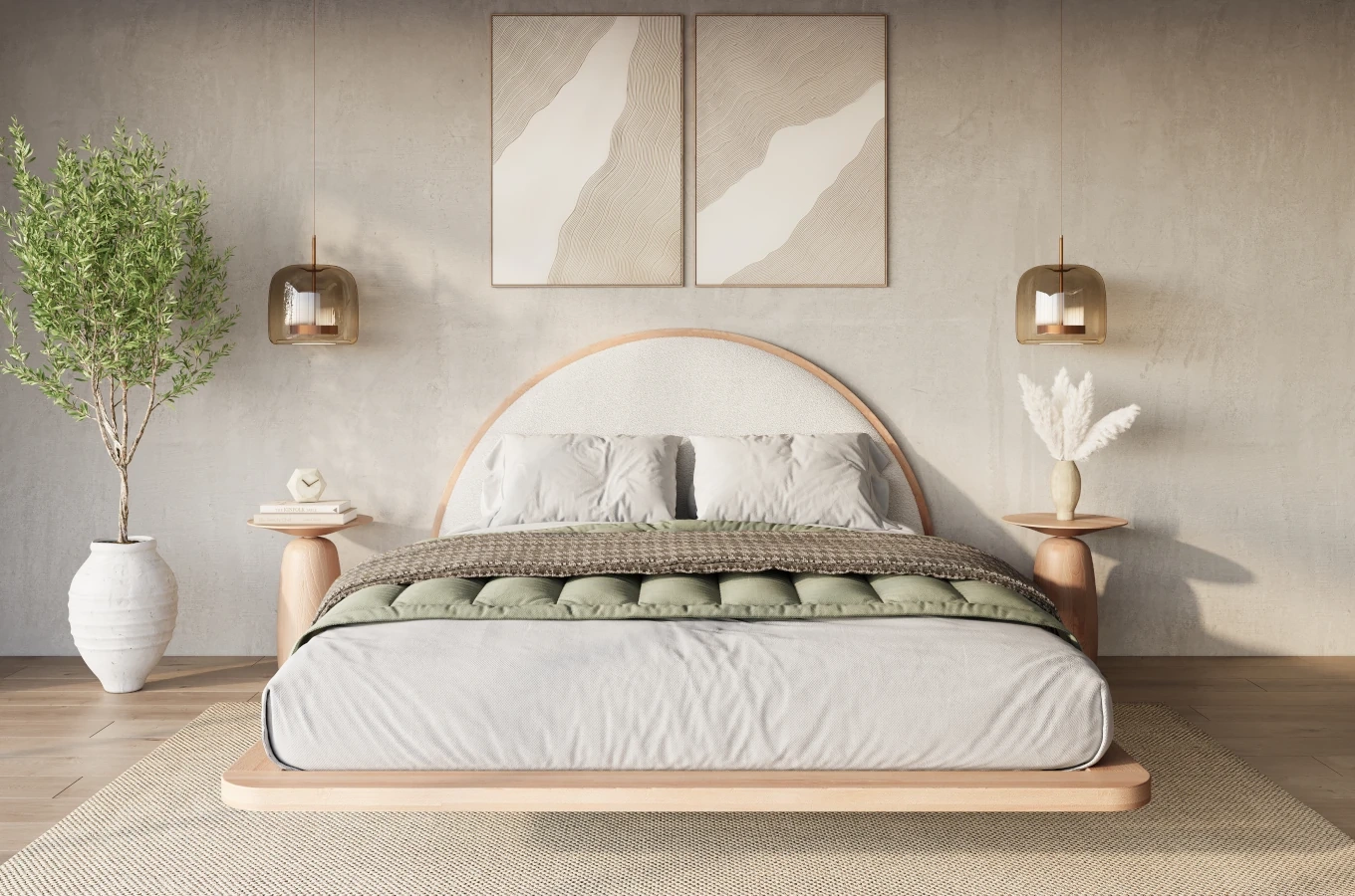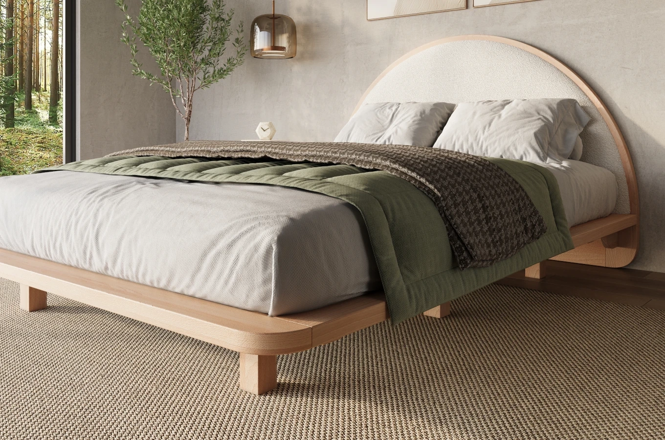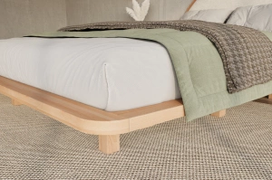 Tapicerowane łóżko drewniane w stylu japandi