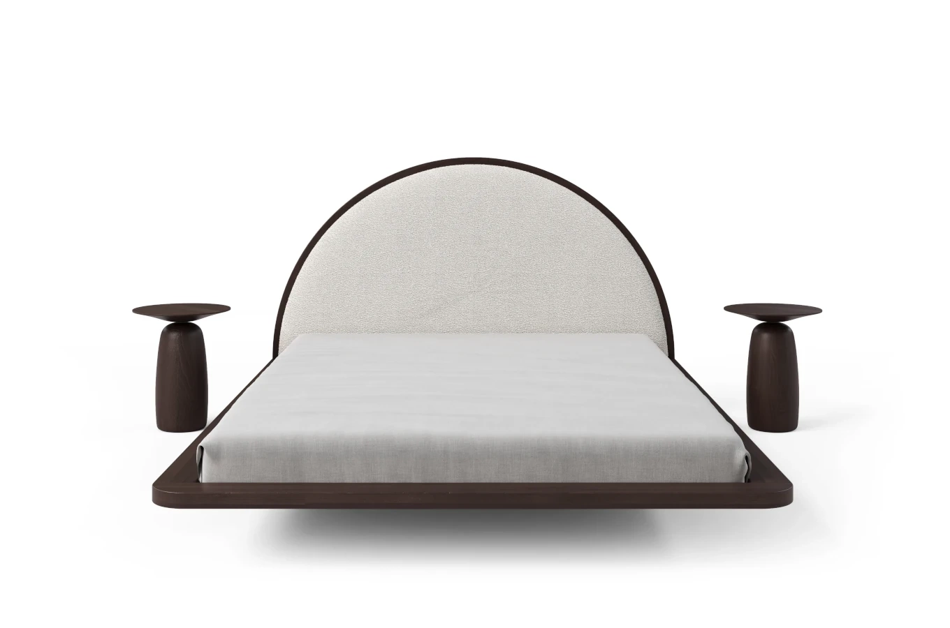 Centralny punkt łóżka stanowi tapicerowany zagłówek o owalnym kształcie, wykończony tkaniną typu boucle (Catch Me 01), która wyróżnia się przyjemną w dotyku fakturą i eleganckim wyglądem. Gruba, 4-centymetrowa rama nie tylko podnosi walory estetyczne mebla, ale również pełni funkcję praktyczną – to idealne miejsce na odłożenie książki, telefonu czy delikatnej dekoracji.