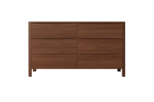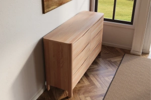 Drewniana komoda bukowa Visby MODENA LOW 150 to doskonałe połączenie nowoczesnej elegancji z praktycznym zastosowaniem. Jej harmonijna forma zachwyca łagodnie zaokrąglonymi narożnikami i charakterystycznym frezowaniem, które biegnie przez całą szerokość frontów. Trójkątna rynna nie tylko zastępuje tradycyjne uchwyty, ale staje się również wyrazistym elementem dekoracyjnym, wpisującym się w ponadczasową estetykę. Aż sześć pojemnych szuflad, osadzonych na prowadnicach z systemem cichego domyku i hamulcem, zapewnia wygodne, bezgłośne użytkowanie i dużą ilość miejsca do przechowywania – bez kompromisów.