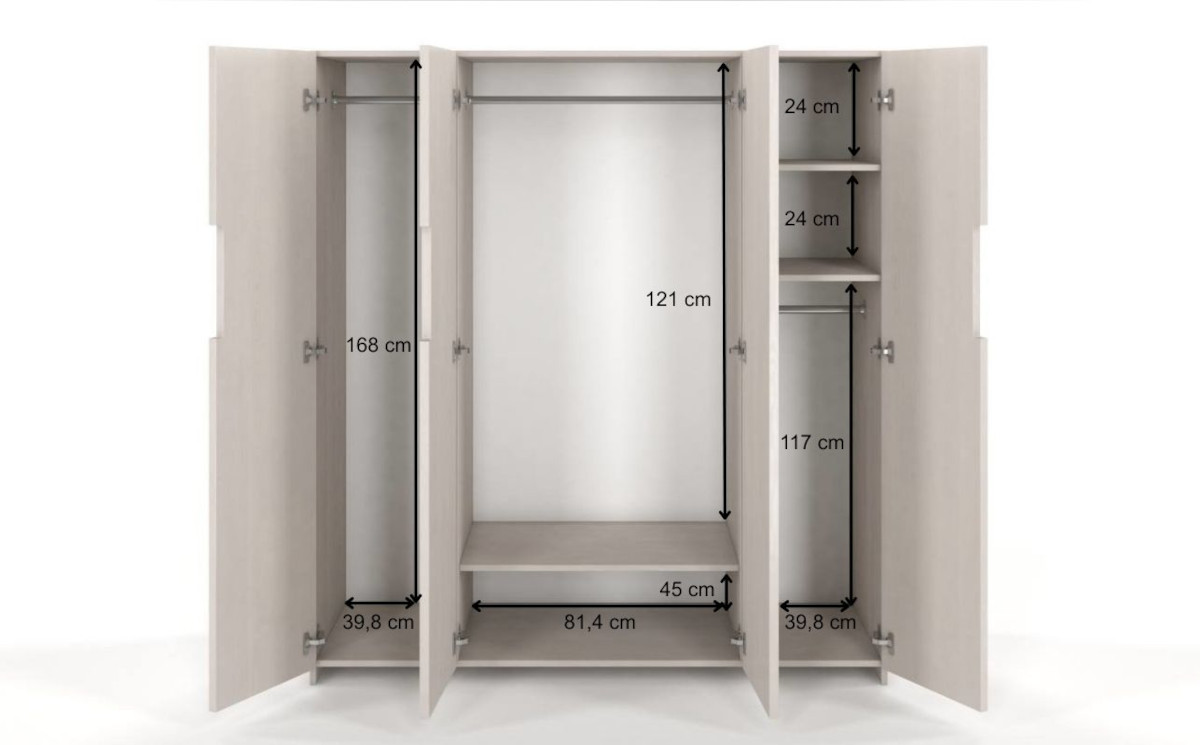 Solidnie wykonana, czterodrzwiowa drewniana szafa - idealna zarówno do sypialni jak i pokoju, a nawet przedpokoju. Za jej drzwiami znajduje się podzielona na trzy części przestrzeń z trzema drążkami i trzema półkami. To doskonały mebel, w którym bez problemu znajdziemy wygodne miejsce do przechowywania zarówno długich sukienek jak i krótszych męskich garniturów.