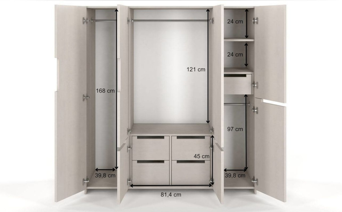 Solidnie wykonana drewniana szafa - idealna do sypialni, pokoju, a nawet przedpokoju. Za jej drzwiami znajduje się podzielona na trzy części przestrzeń z trzema drążkami, dwiema półkami oraz 5 szufladami. Oryginalnym i nietypowym rozwiązaniem jest zastosowanie niezależnych i niesymetrycznie ułożonych drzwi, które ułatwiają dostęp do szuflad, drążków i półek bez konieczności otwierania całej szafy. To doskonały mebel, w którym bez problemu znajdziemy wygodne miejsce do przechowywania długich sukienek jak i krótszych męskich garniturów.