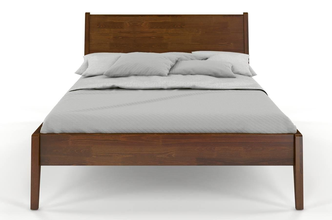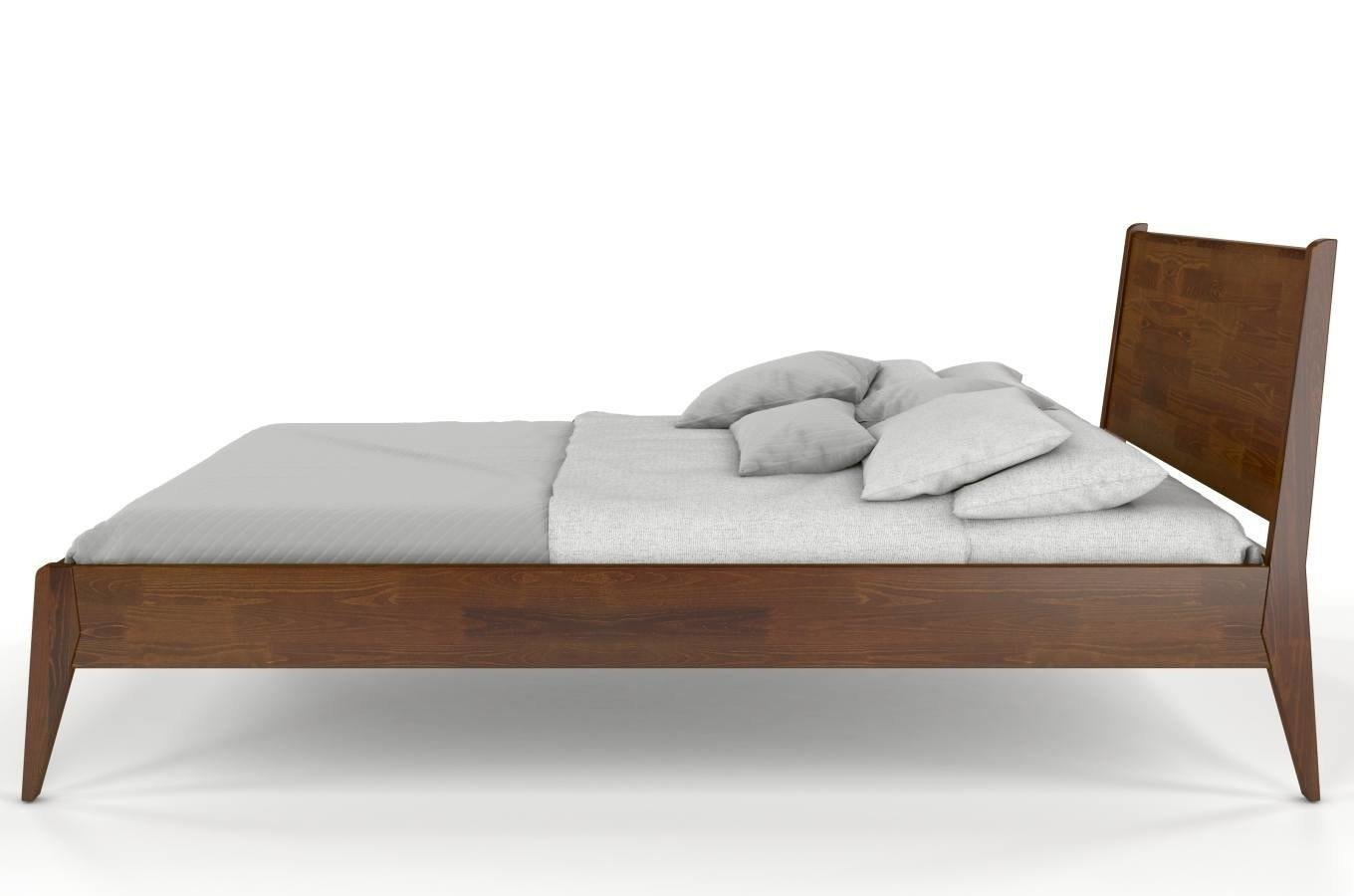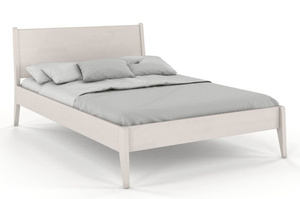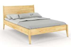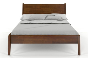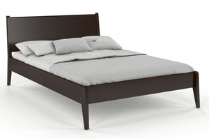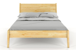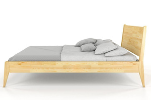 To nowoczesne, oszczędne i lekkie w formie drewniane łóżko do sypialni, które zdecydowanie wyróżnia się na tle innych, drewnianych łóżek. Posiada ono drewniany zagłówek, który w zestawieniu z podpierającymi go wspornikami, które są jednocześnie jego krawędziami, tworzy bardzo ciekawą formę. Te właściwości w zestawieniu ukośnie uciętymi nogami sprawiają, że mebel wygląda bardzo dynamicznie i na pewno spodoba się osobom lubiącym nowoczesny styl.