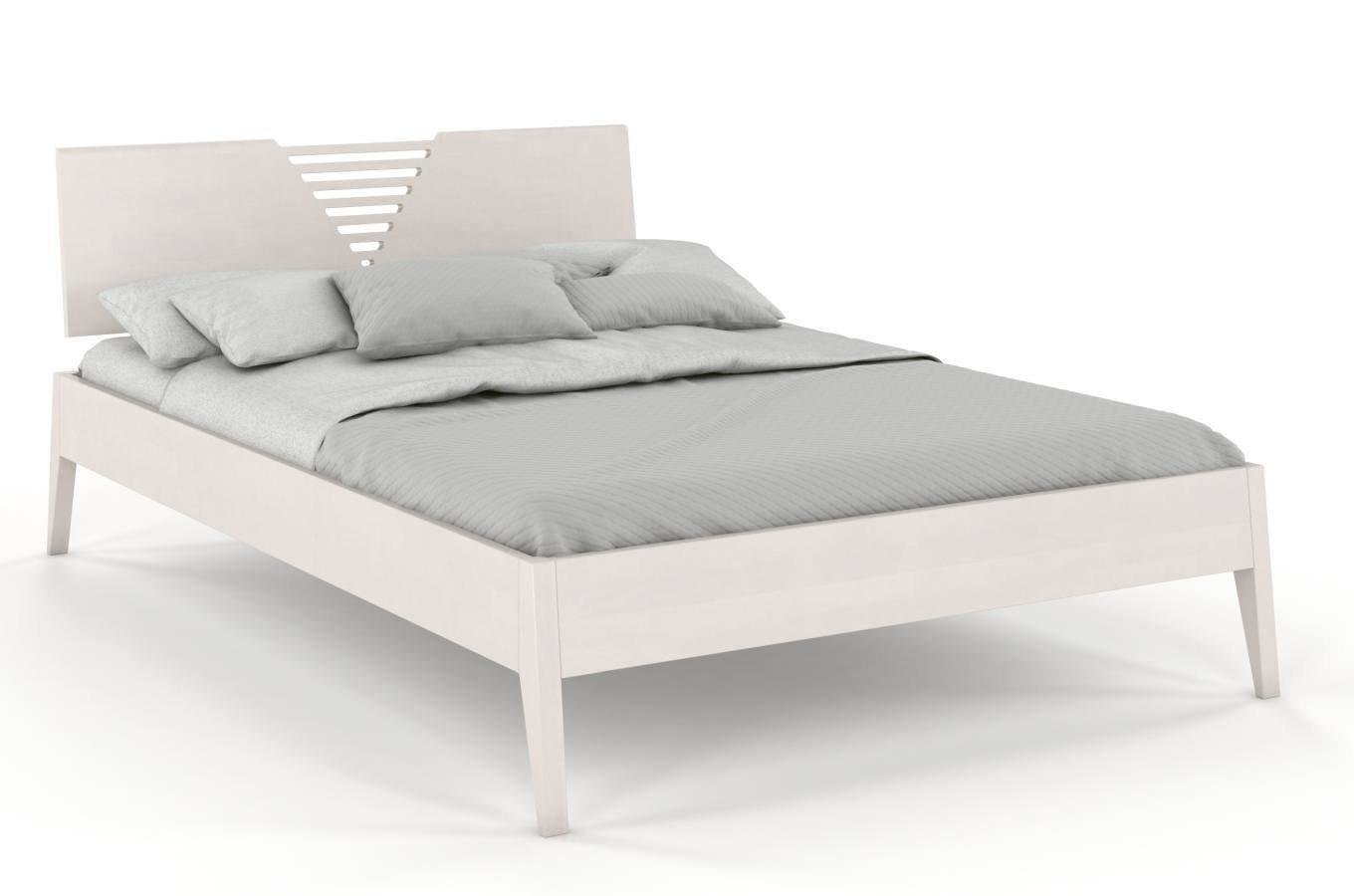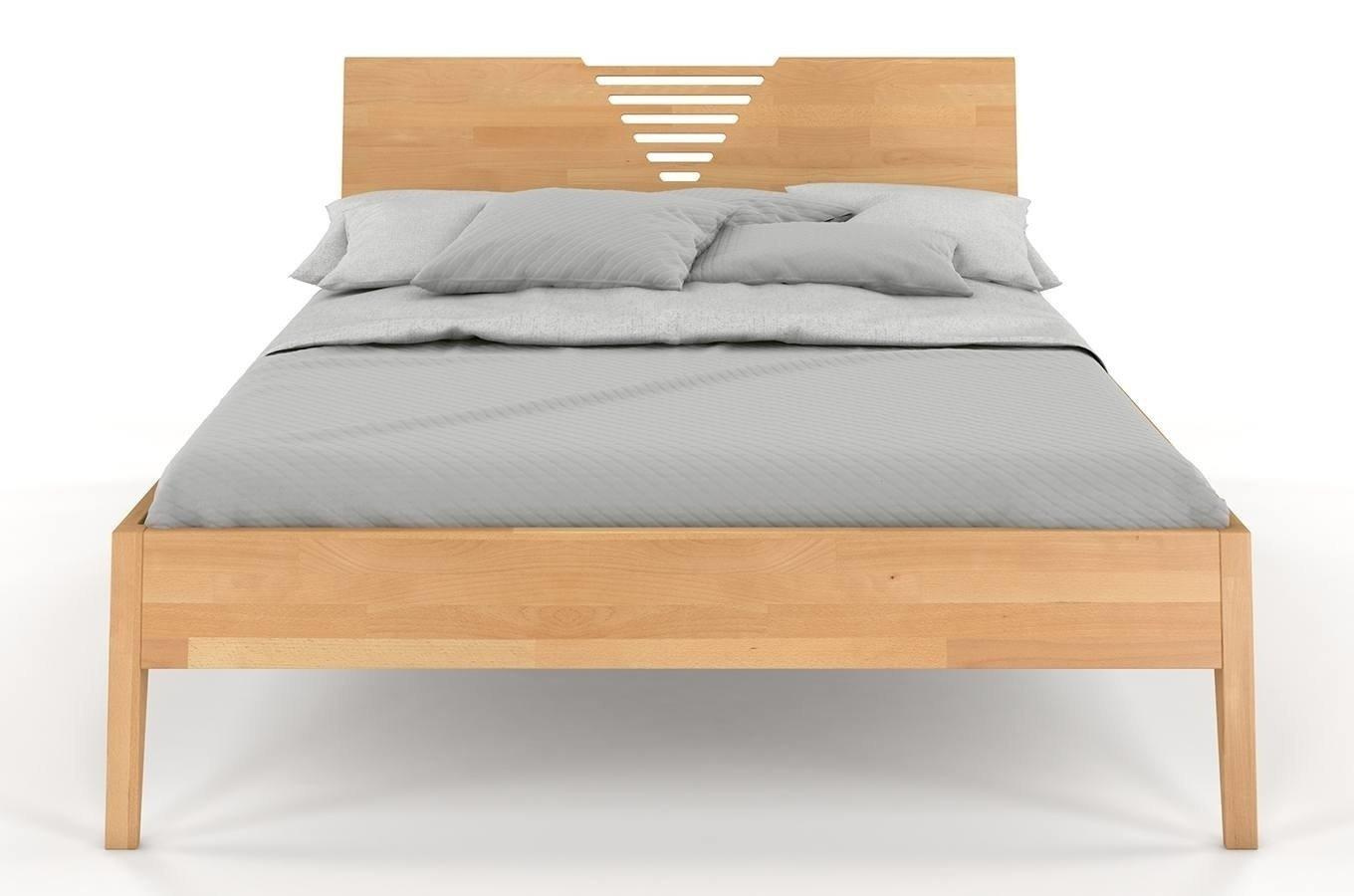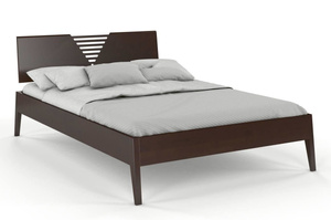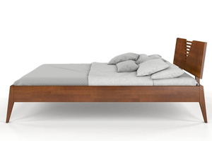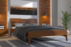 To nowoczesne, oszczędne i lekkie w formie drewniane łóżko do sypialni, które zdecydowanie wyróżnia się na tle innych. Prosta forma mebla, niezobowiązująca dekoracja w postaci ażurowego wycięcia w zagłówku w zestawieniu z podpierającymi go wspornikami tworzy bardzo ciekawy i praktyczny w użytkowaniu mebel. Te właściwości w zestawieniu z ukośnie uciętymi nogami sprawiają, że mebel wygląda bardzo dynamicznie i na pewno spodoba się osobom lubiącym nowoczesny styl.