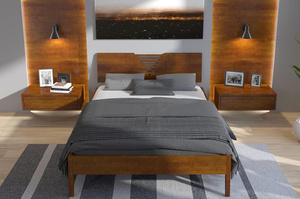 To nowoczesne, oszczędne i lekkie w formie drewniane łóżko do sypialni, które zdecydowanie wyróżnia się na tle innych. Prosta forma mebla, niezobowiązująca dekoracja w postaci ażurowego wycięcia w zagłówku w zestawieniu z podpierającymi go wspornikami tworzy bardzo ciekawy i praktyczny w użytkowaniu mebel. Te właściwości w zestawieniu z ukośnie uciętymi nogami sprawiają, że mebel wygląda bardzo dynamicznie i na pewno spodoba się osobom lubiącym nowoczesny styl.